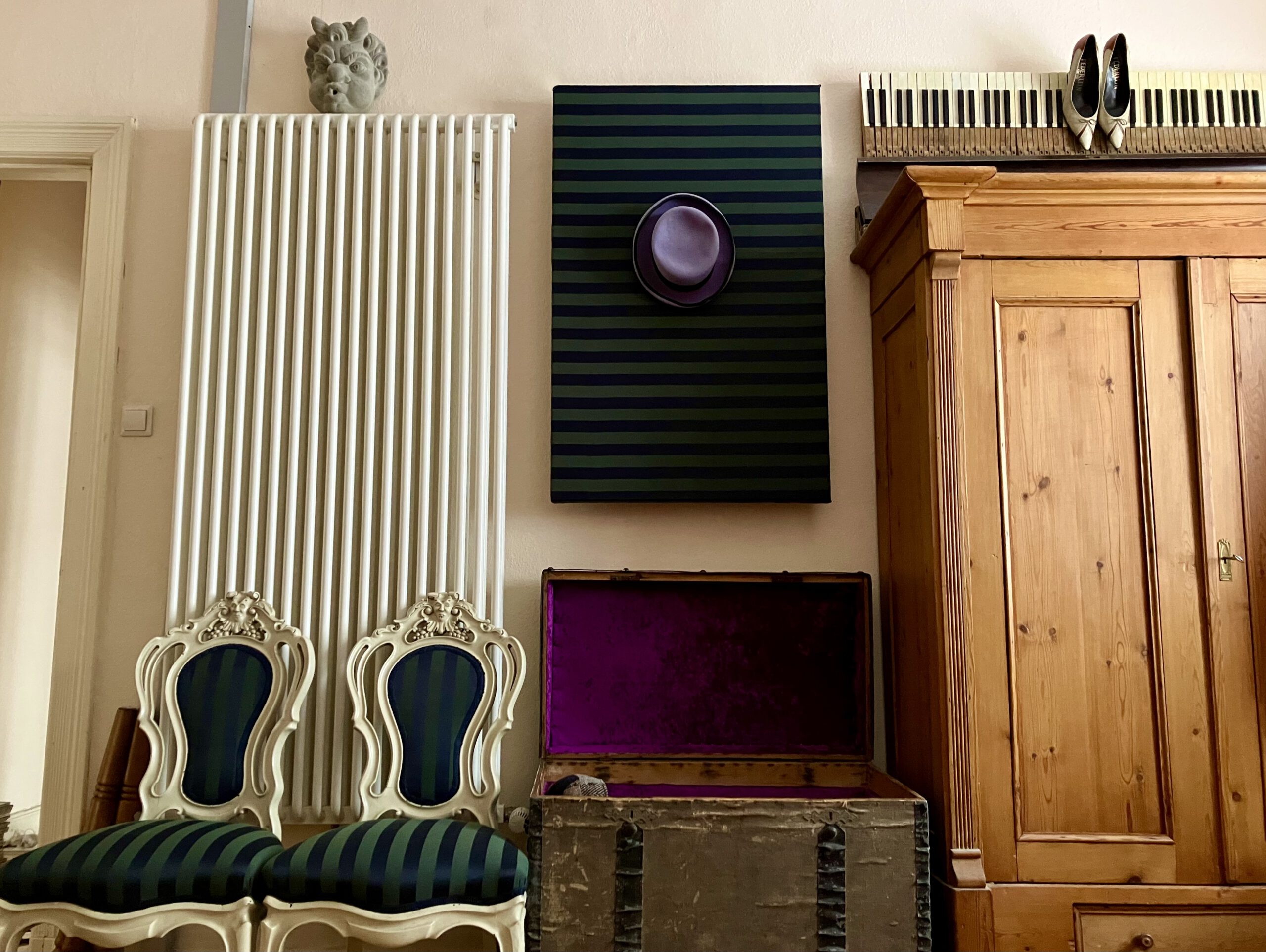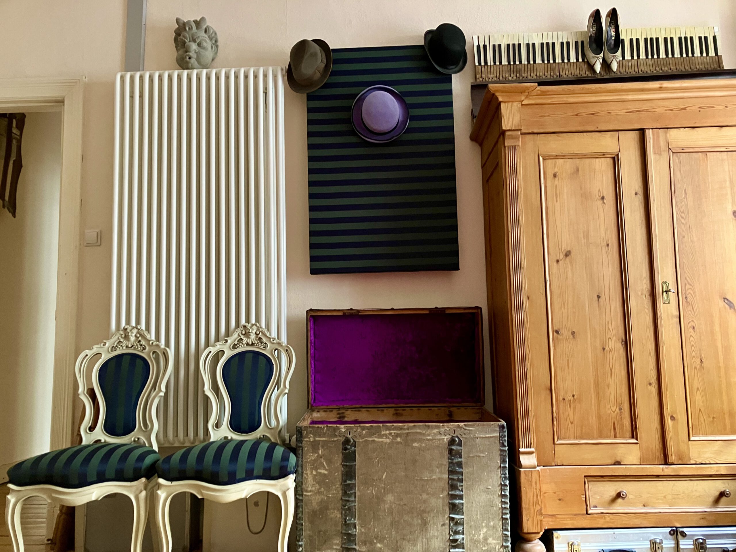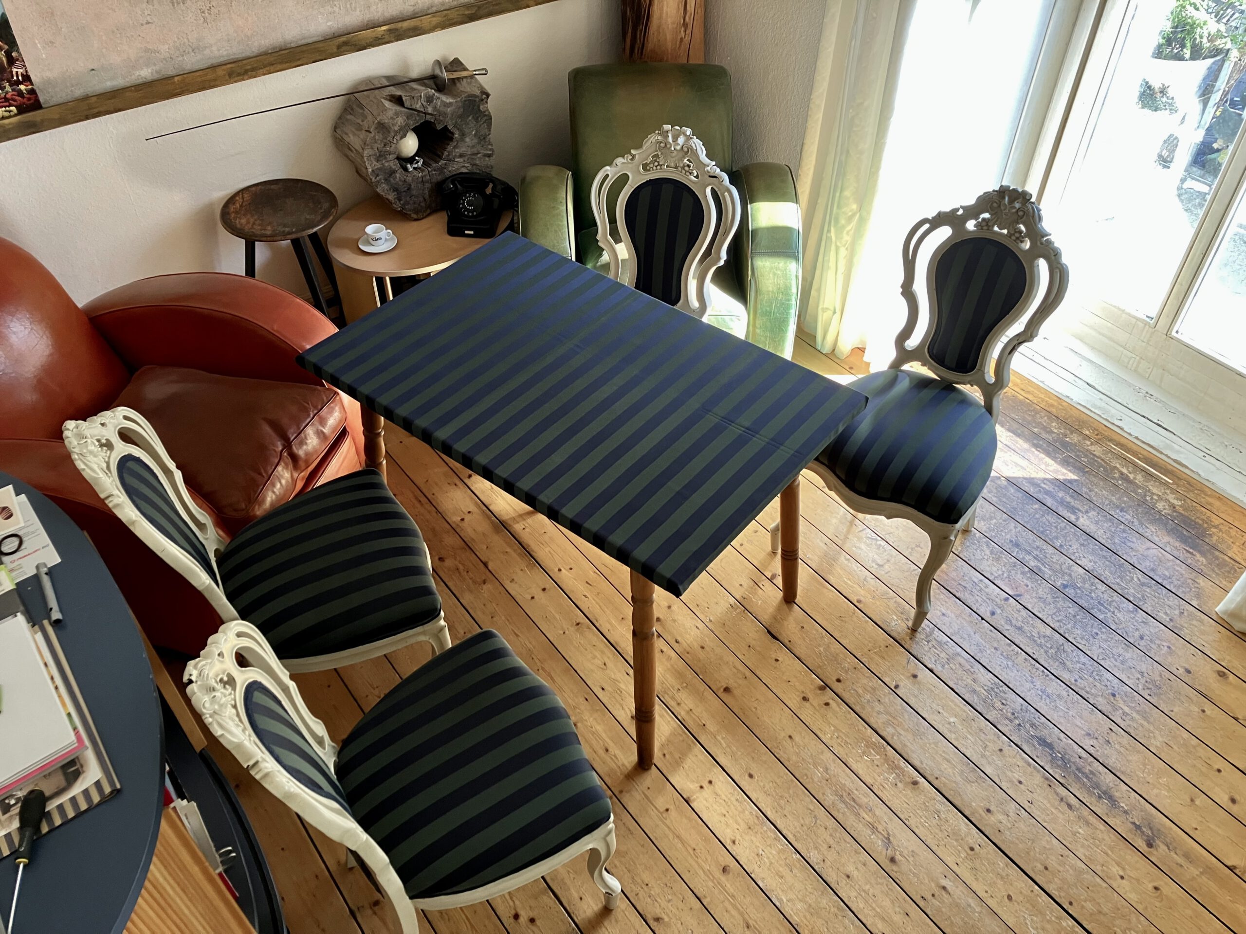 Bombastico! Das ist ja ne schicke Idee für optimale Wohnraum-Nutzung. Das Ensemble sieht toll aus und an der Wand mit Hut – top. Ich wär nicht drauf gekommen den Tisch zu beziehen.