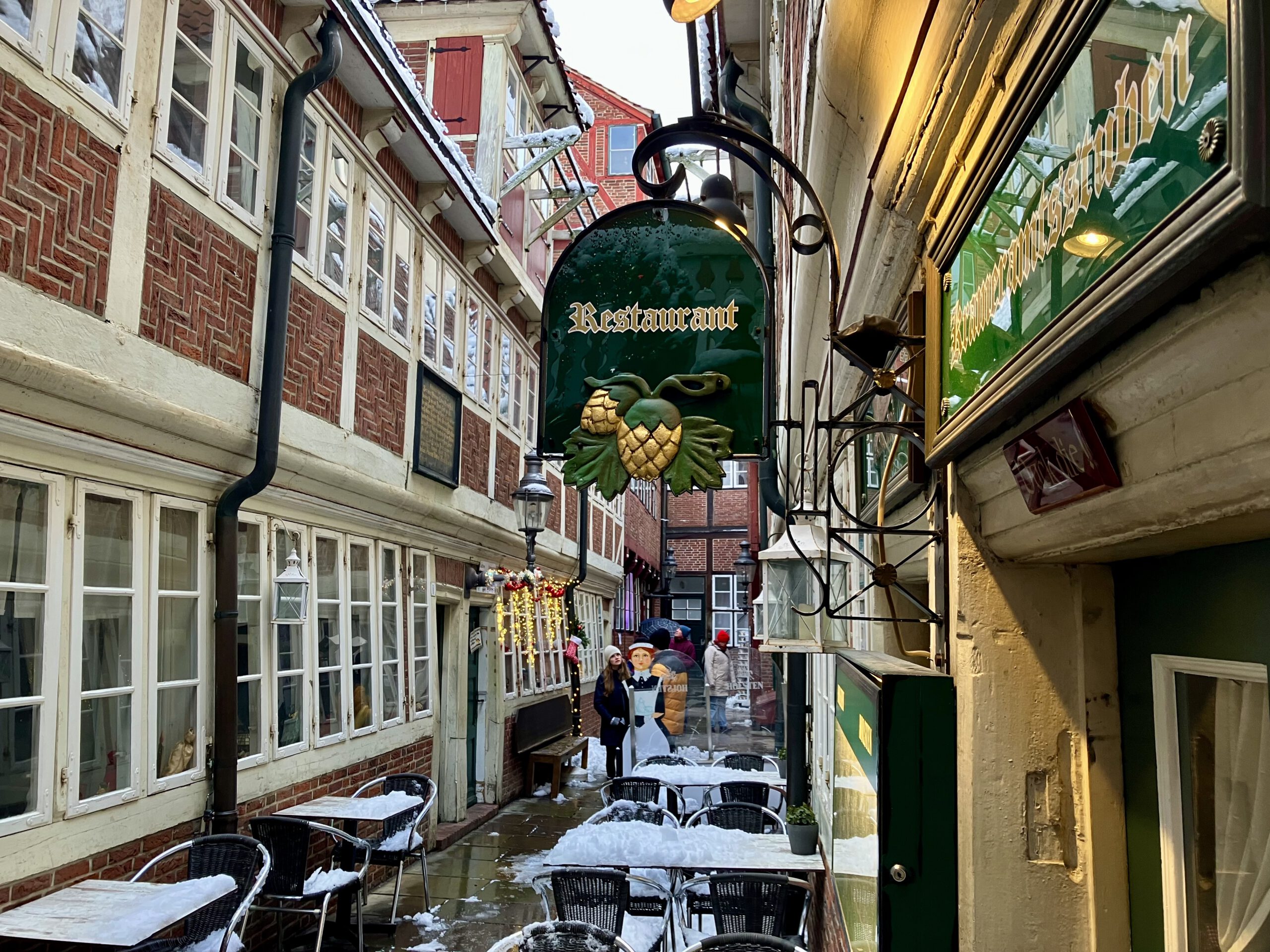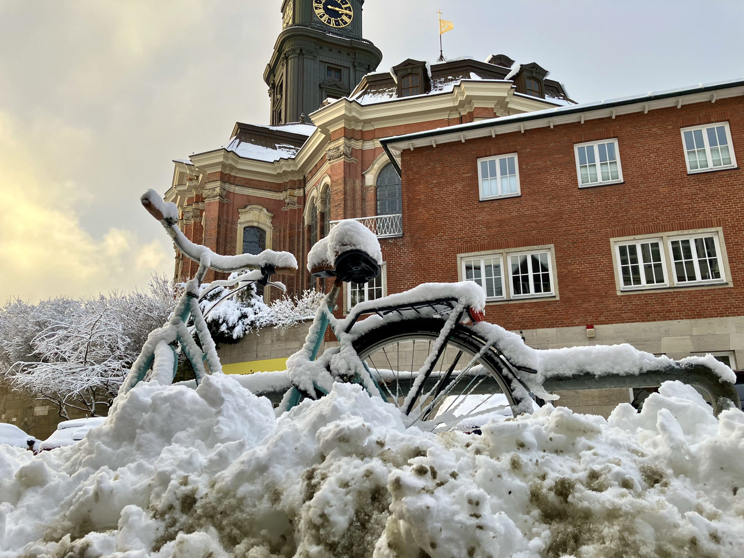 Wegen Elli, dem Sturmtief und aktueller Witterungsverhältnisse sowie der enormen Höhe von 132,14 Metern des charakteristischen Kirchturms passt der Michel gleich gegenüber der Krameramtsstuben leider nur im verschneiten Anschnitt aufs Foto.